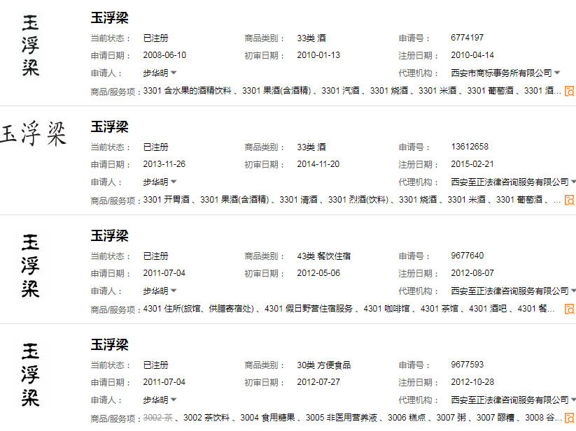 案情简介:2008年6月10日,西安卫尔康安市场营销服务有限公司在第33酒类商品上申请注册第6774197 号“玉浮梁”文字商标,于2010年4月14日获准注册,而后又在2011年7月4日和2013年11月26日分别提交了3件 “玉浮梁”商标,均被核准。