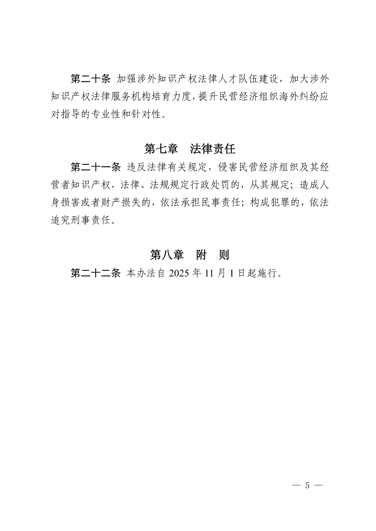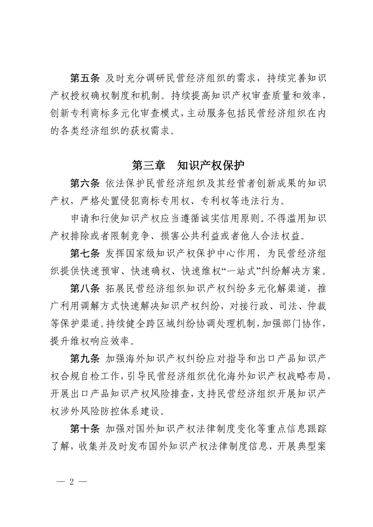 (二)知识产权保护方面,明确加大对民营经济组织及其经营者创新成果的知识产权保护力度,依法查处侵犯商标专用权、专利权等违法行为(第六条),发挥国家级知识产权保护中心作用加强知识产权快速协同保护,为民营经济组织提供专利快速预审、专利快速确权“一站式”纠纷解决方案(第七条),拓展民营经济组织知识产权纠纷多元化解渠道(第八条)以及加强涉外知识产权保护工作,提升涉外知识产权风险预警防控能力。