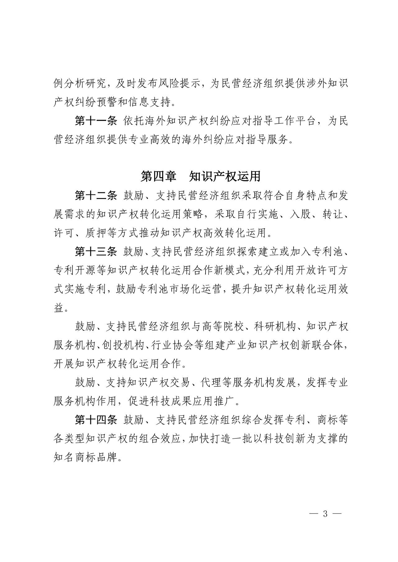 (三)知识产权运用方面,明确鼓励、支持民营经济组织采取符合自身特点和发展需求的知识产权转化运用策略,采取自行实施、入股、转让、许可、质押等方式推动知识产权高效转化运用(第十二条),鼓励、支持民营经济组织探索建立专利池、专利开源等知识产权转化运用合作新模式,充分利用开放许可方式实施专利,组建产业知识产权创新联合体(第十三条)以及鼓励、支持民营经济组织综合发挥专利、商标等各类型知识产权的组合效应,加快打造以科技创新为支撑的知名商标品牌(第十四条)。